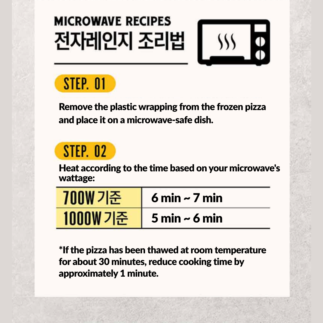• Heat frozen pizza at 1000W for 6–7 minutes