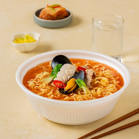 Noodles: Wheat Flour (USA, Australia), Palm Oil (Malaysia), Modified Starch, Potato Starch (Germany, Denmark), Sweetening Oil, Refined Salt, Gluten, Vegetable Flavoring Liquid, Alkaline Agent for Noodles (Acidity Regulator), Guar Gum, Acidity Regulator, Propylene Glycol Alginate, Green Tea Flavoring Liquid, Vitamin B2 Soup: Refined Salt, Sodium L-Glutamate (Flavor Enhancer), Dried Cabbage, Sugar, Flavor Base, Stir-fried Jjamppong Seasoning, Dried Squid Seasoning Powder, Concentrated Soy Sauce Powder, Seafood Jjamppong Powder, Dried Squid Flakes, Spicy Seasoning Powder, Soy Sauce Powder, Brewed Soy Sauce Powder, Dried Green Onion, Dried Chinese Cabbage, Spicy Flavor Powder, Shrimp Powder, Seasoned Minced Garlic Powder, Seasoned Soy Sauce Liquid Powder, Seasoned Anchovy Base Powder, Flavor Enhancer, Dried Seaweed, Flavor Enhancer, Acidity Regulator, Iron Plate Flavoring Oil, Paprika Extract Color, Ground Ginger Flavor Powder