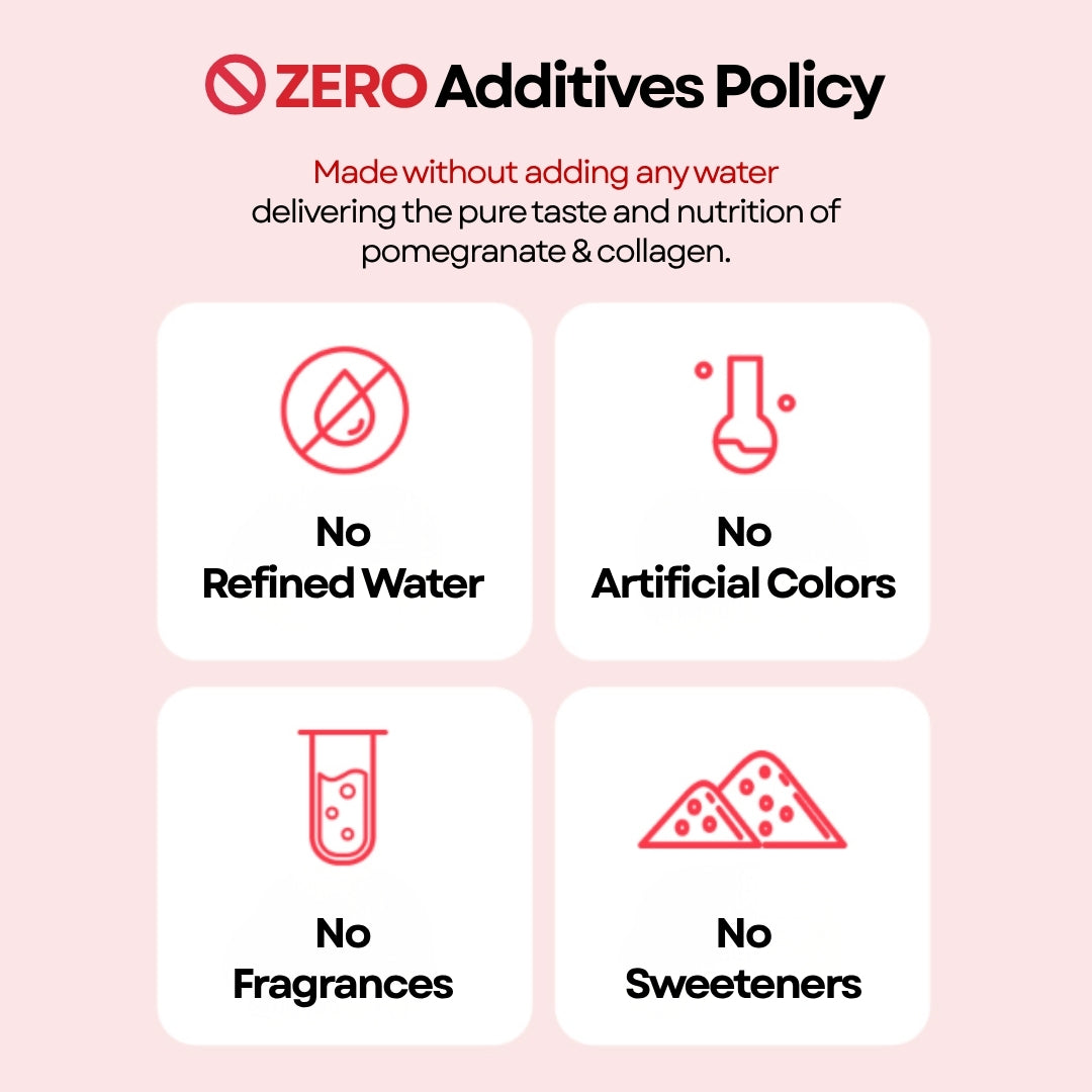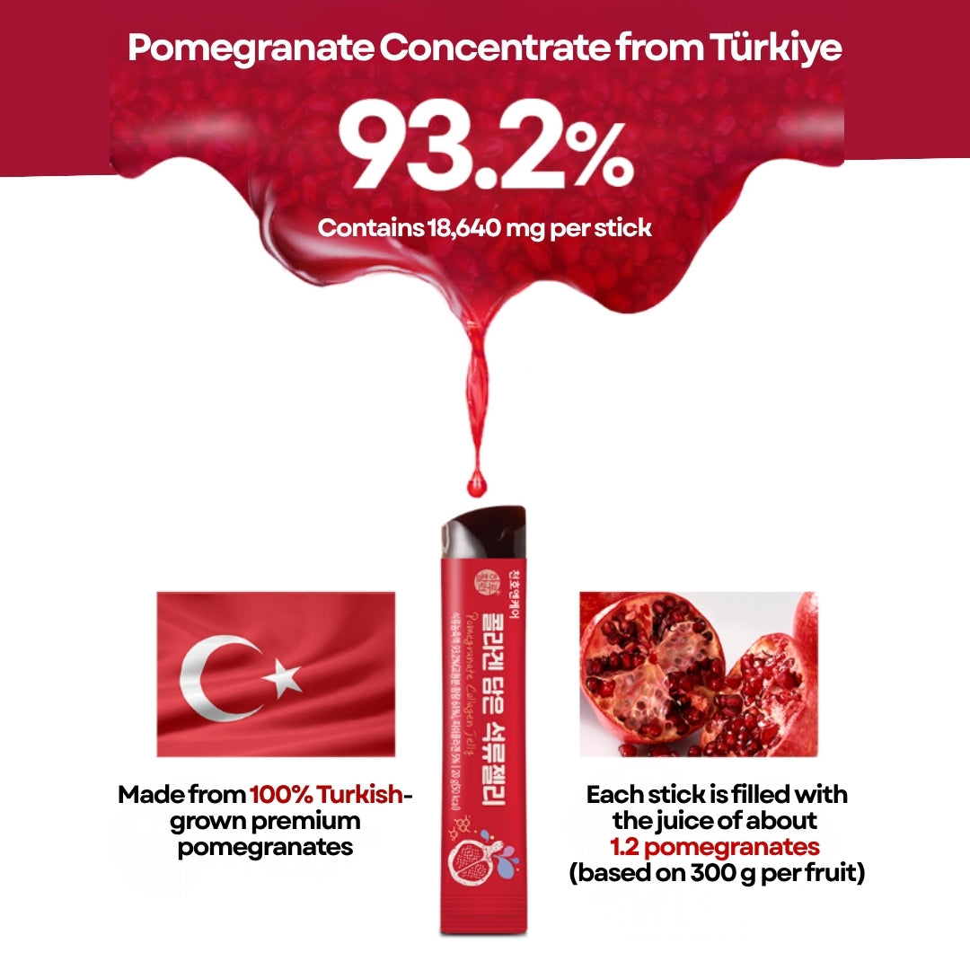 โข Ingredients: Pomegranate Concentrate 93.2% (Solid 61%, Turkey), Fish Collagen 5%, Processed Agar (China), Hyaluronic Acid, Hibiscus Extract (Taiwan)