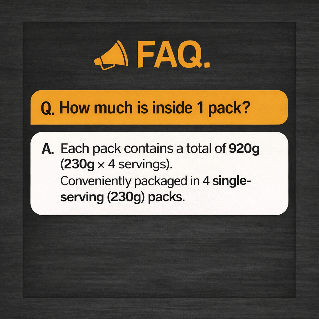 Net Weight: 920g (230g x 4 individual servings) • Composition: 4 Individual Pouches • Storage: Keep frozen (-18°C or below). • Manufacturer: Ashley (E-land Eats) • Caution: Do not refreeze once the product has been thawed. Handle with care after heating as the steam and container will be hot.