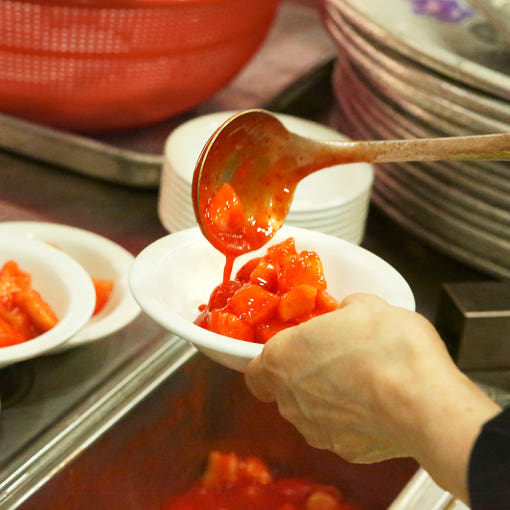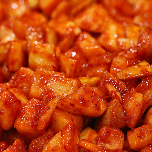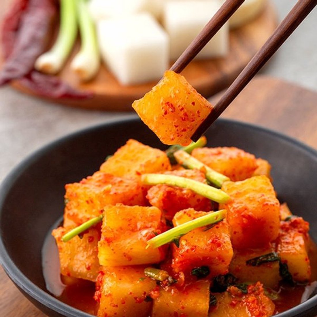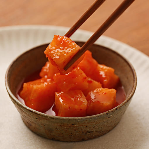 Our Kkakdugi is handmade in Singapore with carefully selected ingredients. The radishes are cut into cubes, salted for a short time, and then mixed with a rich seasoning blend, ensuring a well-balanced taste with the perfect crunch.