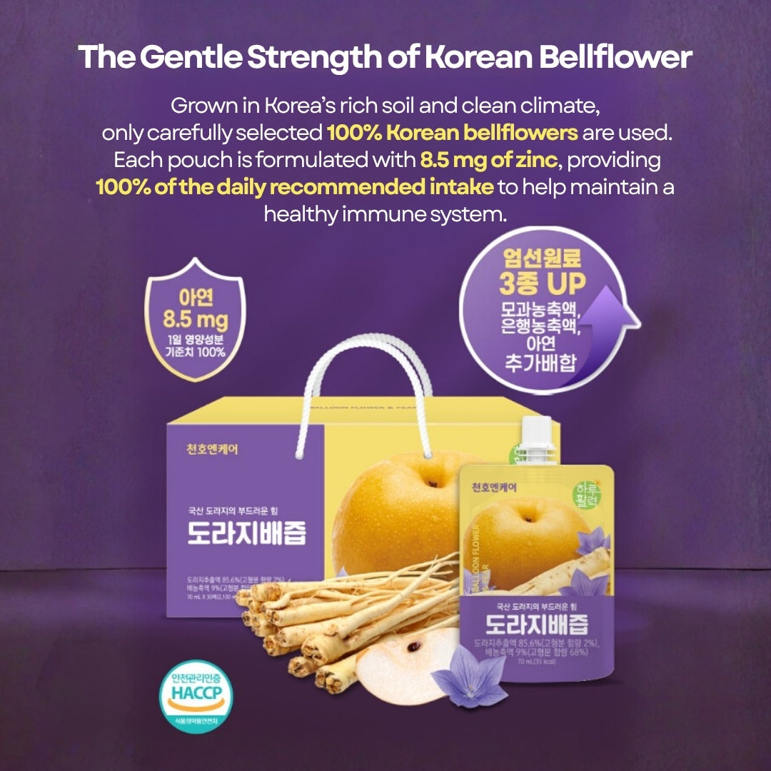 Experience natural wellness with Chunho N Care’s Balloon Flower & Pear Juice, made from 100% Korean-grown pears and fresh raw balloon flower roots (not dried).