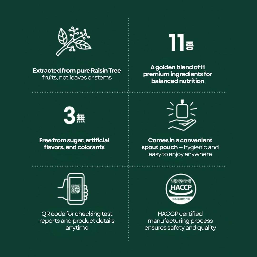 Chunho N Care’s Oriental Raisin Tree Juice is made with 60% high-quality Hovenia dulcis fruit extract, valued in traditional Korean medicine for its detoxifying and liver-supporting properties.