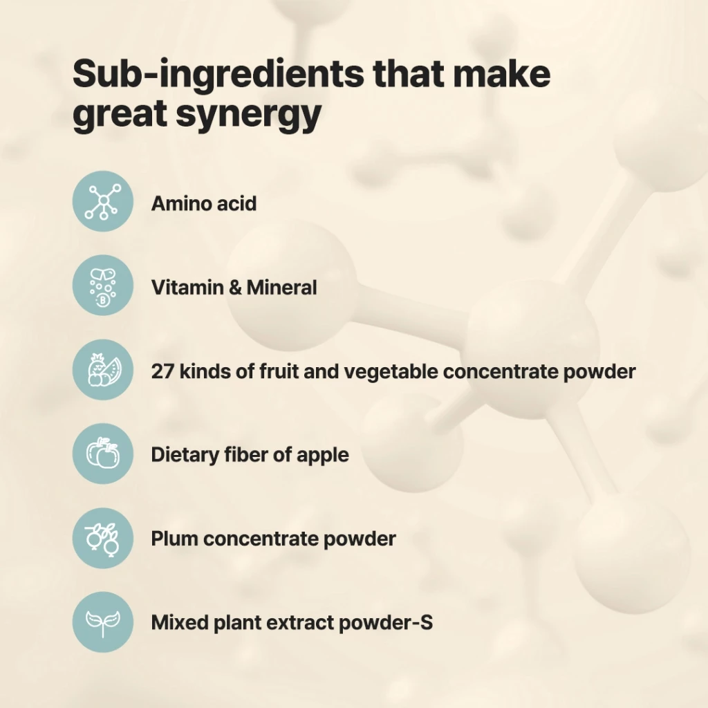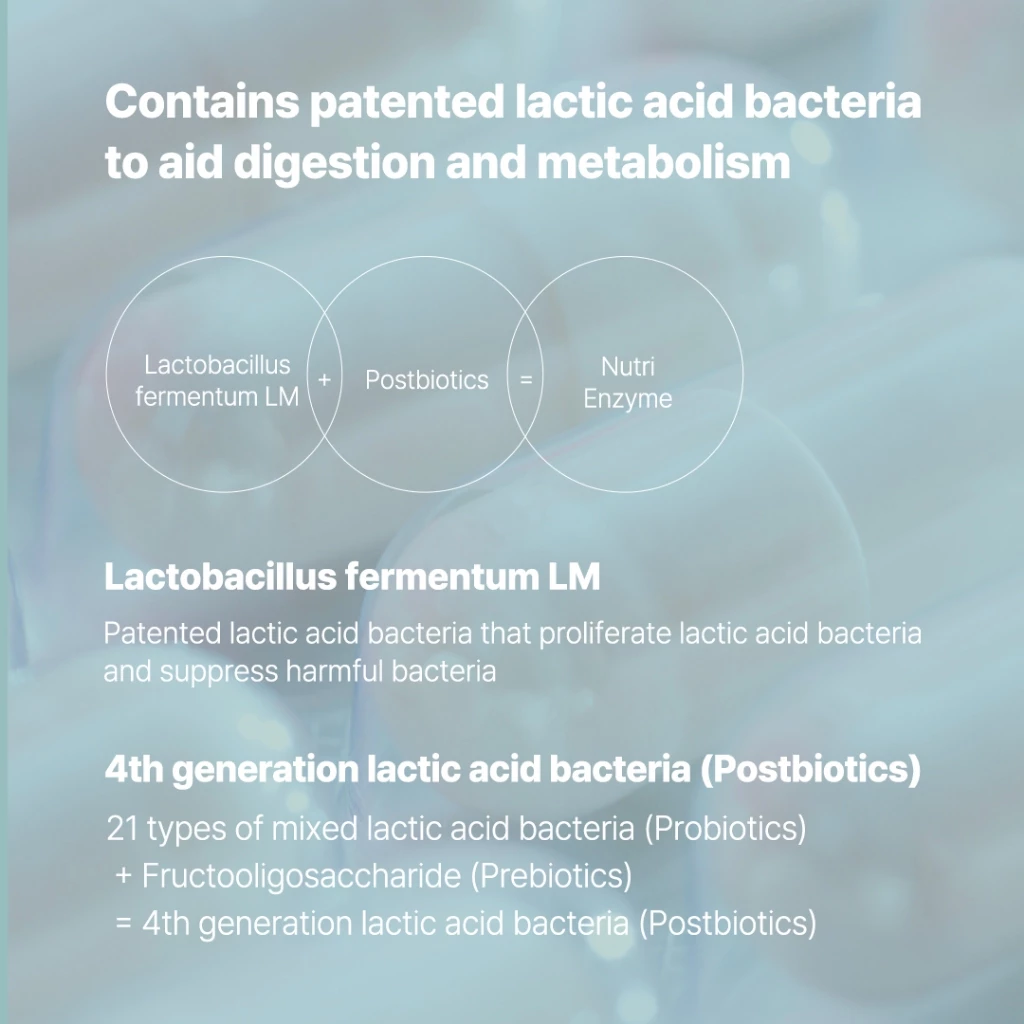 ย : It contains patented lactic acid bacteria that help digestion and metabolism and ingredients that enhance synergy.