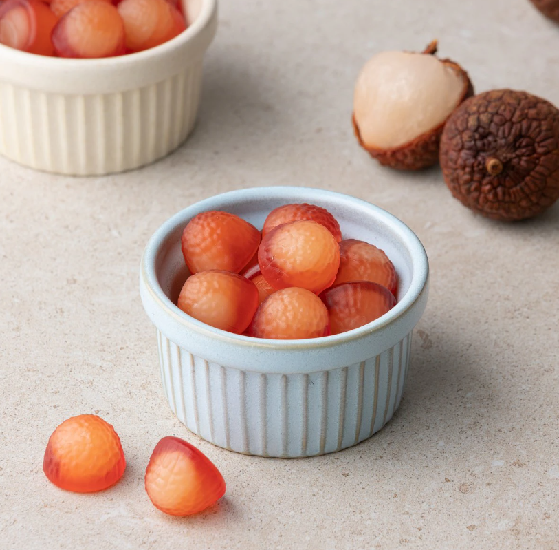 • Corn Syrup, Sugar, D-Sorbitol Solution 13.4%, Oligosaccharide, Concentrated Apple Juice, Gelatin, Processed Sugar Product, Lychee Juice, Pectin, Acidity Regulators (3 types), Carrageenan, Glucose, Potassium Chloride, Calcium Lactate, Flavor (Lychee Flavor), Black Carrot Concentrate, Gardenia Yellow, Titanium Dioxide (Colorant), Ethanol, Other Processed Edible Oils